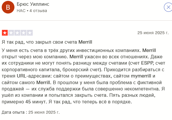 Репутация Merrill Lynch в руинах. Trustpilot показывает 1,3 звезды из 5. Основа – 116 отзывов. Большинство ставят 1 звезду. Это указывает на системный провал.
