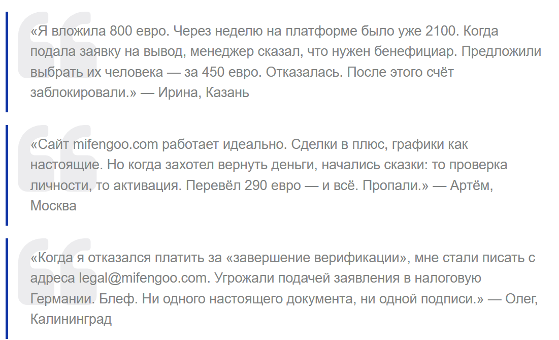 В сети много негативных отзывов о работе на бирже с MiFengoo com. Пользователи утверждают, что брокер имитирует торговлю. По факту сервис просто присваивает себе деньги клиентов, так как вывести средства со счета они уже не могут. По этой причине трейдеры не рекомендуют работать с данным проектом.
