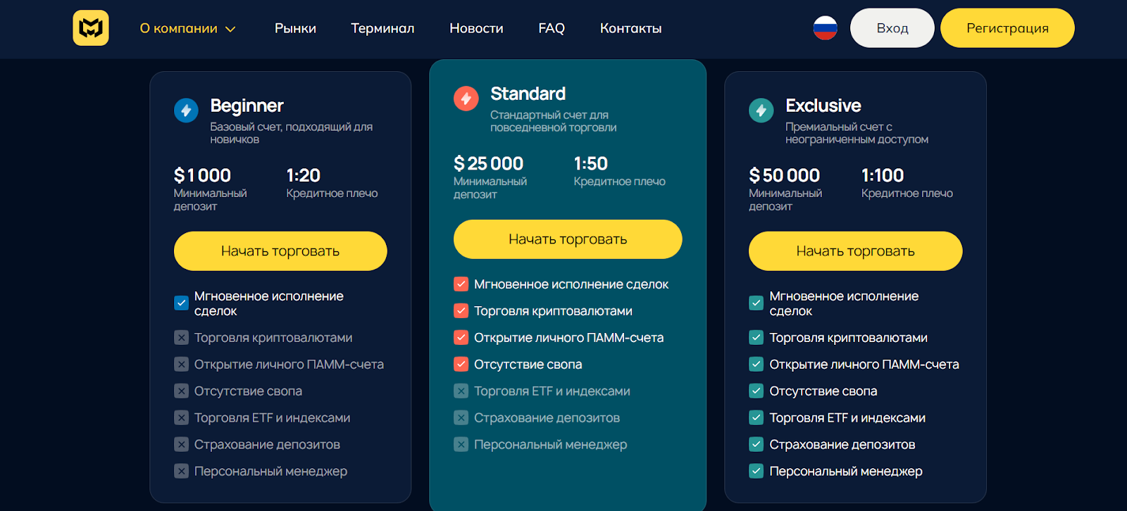 - Standart — депозит от 25 000$ и кредитное плечо 1:20;