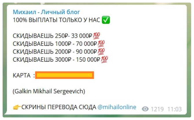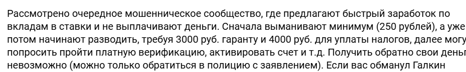После этого нужно было оплатить услуги гаранта или внести другие дополнительные платежи, причем схема не заканчивалась до тех пор, пока клиент дает деньги. В итоге никто свои средства получить не смог, а так как положительные отзывы о Михаиле Галкине в Телеграм отсутствуют, это говорит о высоких рисках при сотрудничестве.