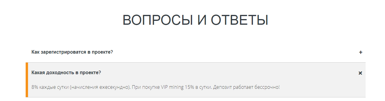 Mineex pro предлагает инвестиционные планы с доходностью до 8% в сутки и возможностью увеличения до 15% при покупке VIP-майнинга. Минимальный депозит составляет 20 рублей, минимальная сумма для вывода — 2 рубля. Компания утверждает, что прибыль начисляется каждую секунду, а вывод средств осуществляется мгновенно на Payeer-кошелек.Но такие высокие показатели доходности вызывают сомнения, тем более сервис не предоставляет доказательств реального наличия дата центров с оборудованием для майнинга.