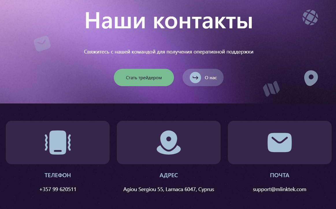 Создатели биржи «Млинктек» утверждают, что юридическое лицо зарегистрировано на Кипре. На сайте указан адрес офиса, однако каких-либо подтверждений регистрации не представлено. В качестве контактных данных представлен номер телефона и e-mail. Есть форма обратной связи.