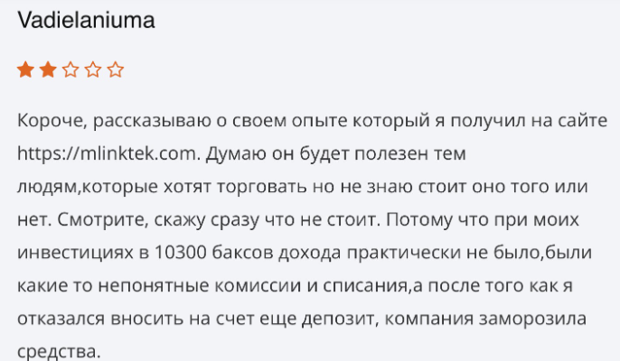 - отрицательные отзывы о Mlinktek com содержат обвинения в мошеннических действиях и присвоении денег клиентов, негативный опыт является поводом задуматься о целесообразности инвестиций в проект.