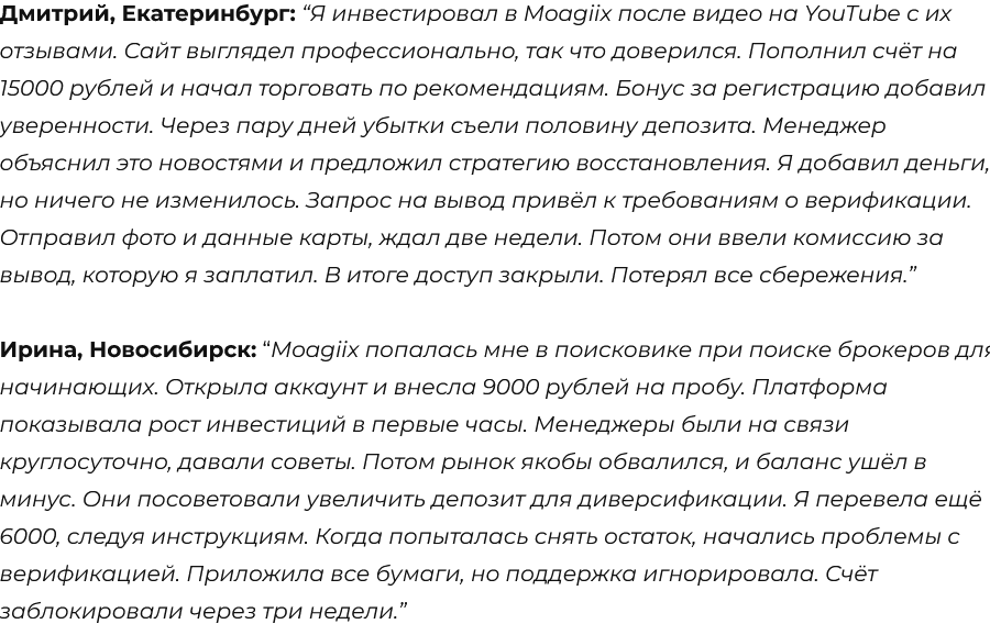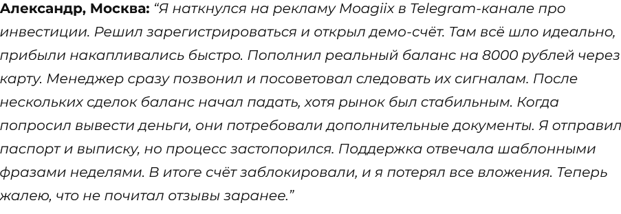 Не удалось установить, были ли на площадке отклики юзеров. На сторонних ресурсах, несмотря на то, что платформа не проработала и месяца, уже успели появиться негативные фидбэки. Люди писали, что реклама брокера распространялась через соцсети, в частности, через Telegram. Во время торговли на демо-счете все шло идеально, человек решил открыть реальный аккаунт на Moagiix, внес ₽8,000. Когда рынок начала падать, клиент попросил оформить вывод, от него потребовали дополнительные документы. Итог: блокировка аккаунта и убытки.