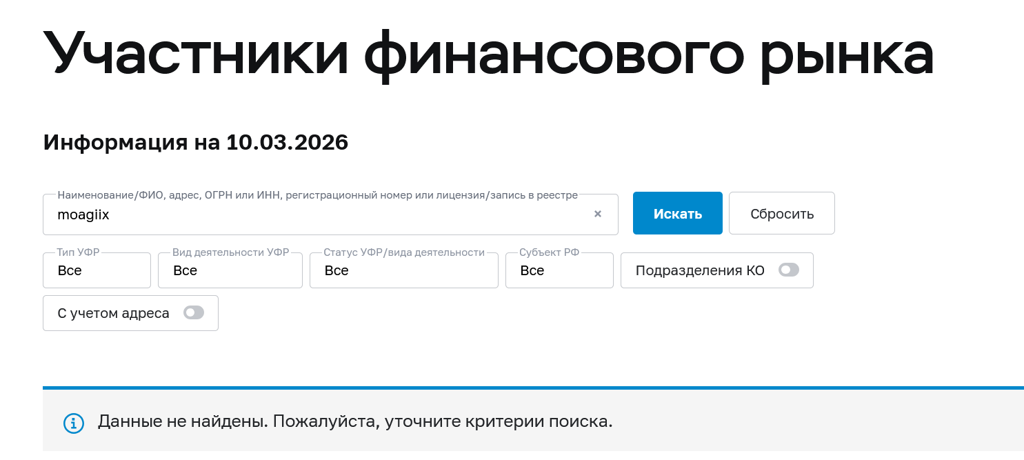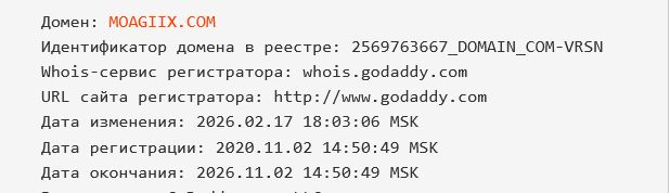 Неизвестно, были ли на сайте сведения о компании-основателе ресурса. Проверка показала, что домен, занимаемый брокером Moagiix, был зарегистрирован во второй половине февраля 2026 года.