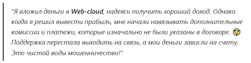 Платформа Web cloud finance отзывы в интернете собирает достаточно негативные. Пользователи обвиняют брокера в мошенничестве, сайт называют скамом и упоминают о невозможности заработать и выводить свои деньги.