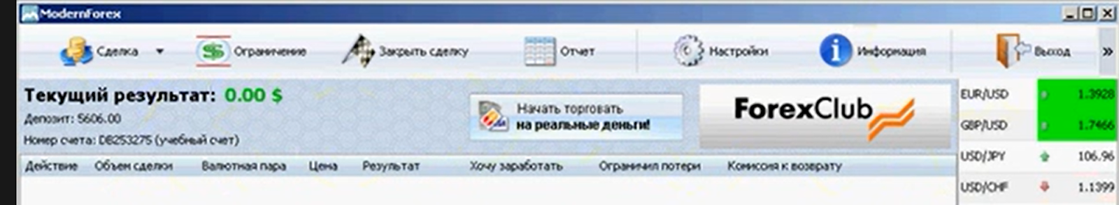 Сейчас, с высоты современных технологий, Modern Forex выглядит довольно архаично. Всего 11 валютных пар, ручное управление сделками через скромные шесть кнопок и отсутствие сложных алгоритмов или копирования сделок. При этом у терминала были свои плюсы: бесплатное пользование для клиентов Forex Club, мультиязычность, а также полезные обучающие материалы.