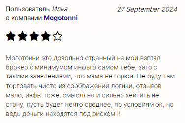Отзывы об инвесторе mogotonni com преимущественно негативные. Можно найти нейтральные комментарии с оценкой 4 звезды, где пользователи говорят, что даже не регистрировались в сервисе. Непонятно, зачем тогда они в положительную сторону меняют рейтинг компании.