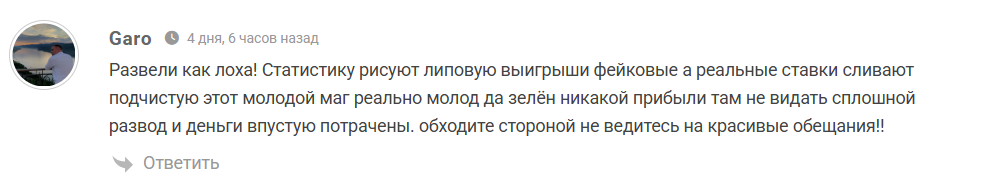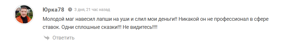 Molodoy Mag в сети не собрал большого количества отзывов, поскольку его канал не является популярным и у проекта мало подписчиков и просмотров. Тем не менее некоторые люди пишут о том, что автор обманывает и сливает деньги своих подписчиков. Он не является профессионалом в сфере ставок.