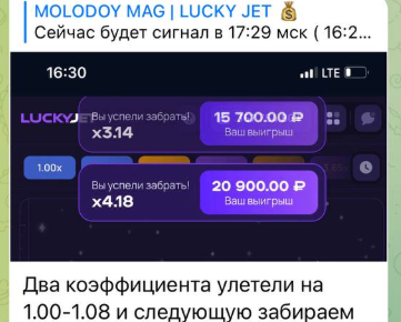 Molodoy Mag публикует различные посты с советами, как выигрывать в азартных играх, в основном на Lucky Jet. Он постит сигналы и заранее предупреждает, в какое время опубликует новые. После рассказывает сколько смог заработать на Lucky Jet и прикладывает скриншоты.