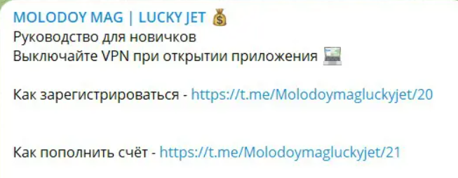 Molodoy Mag | Lucky Jet – канал, который ведет одноименный автор. Он рассказывает о том как зарабатывать в казино и делится собственными советами по азартным играм. Он ведет телеграмм-канал и ютуб-канал, где рекламирует казино и различные сервисы, например vpn для доступа к закрытым азартным играм и сайтам с ними. В сети об авторе не так много отзывов, но его обвиняют в скаме.