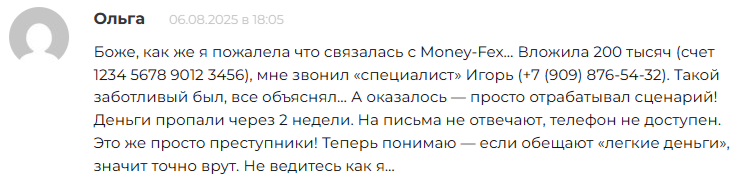 В июне 2025 года в интернете появилась компания Moneyfex, отзывы о которой уже вызывают опасения, несмотря на столь малый срок работы. Компания предлагает трейдерам заключать сделки с акциями, криптовалютами и работать на рынке Форекс в любое время и в любом месте. Но, судя по комментариям, заявления организаторов далеки от реальности.