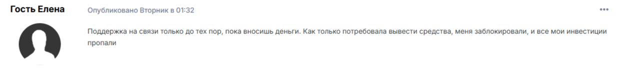 Есть и еще один фидбек от пострадавшей клиентки. Девушка говорит, что служба поддержки проекта на связи до тех пор, пока ты вносишь деньги. Как только клиентка запросила вывод активов, ее аккаунт заблокировали.