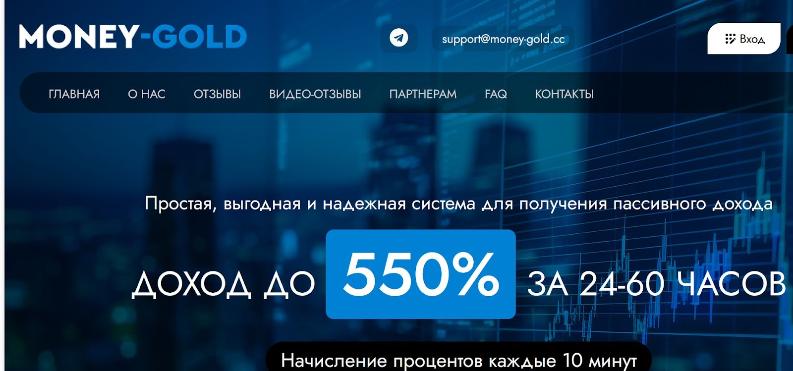 Брокерская компания Money Gold, отзывы о которой в сети чаще всего негативны, заявляет о том, что может обеспечить надежный доход до 550% за 2-3 дня. По словам владельцев организации, проценты начисляются каждые 10 минут, а средства можно вывести на кошелек по первому требованию без комиссий. Рассмотрим торговые условия брокера подробнее, выясним, можно ли здесь заработать или это очередной обман и развод на деньги.