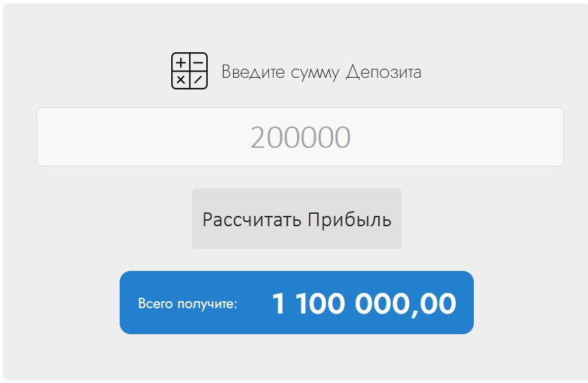 На сайте «МонейГолд» есть специальный калькулятор, который наглядно демонстрирует инвестору его возможную прибыль: при депозите 200 тысяч рублей доход составит 1 миллион 100 тысяч рублей.