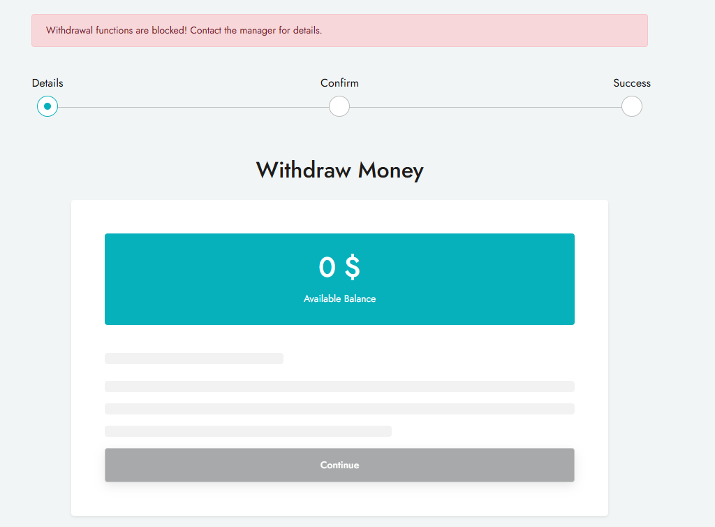 Функция вывода заблокирована, для получения информации клиента просят связаться с менеджером. В другом разделе написано, что для получения средств необходимо вначале пройти идентификацию.