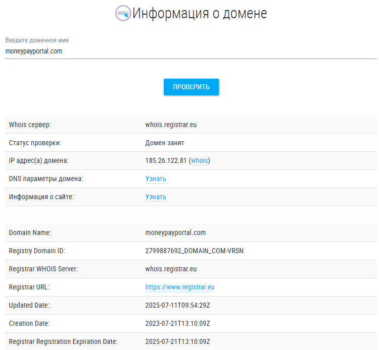 Адрес сайта moneypayportal com был зарегистрирован в середине 2023 года, но обновлен в 2025 году. Информация о владельце домена организации MoneyPay скрыта настройками приватности.