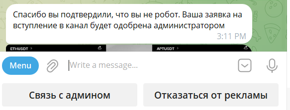 После этого система автоматически одобряет заявку в телеграмм-канал в течение нескольких часов. Бот будет продолжать рассылать рекламные материалы, если не нажать на кнопку «Отписаться от рекламы» в меню, там же можно связаться со специалистом лично, он ответит прямо через профиль в боте.