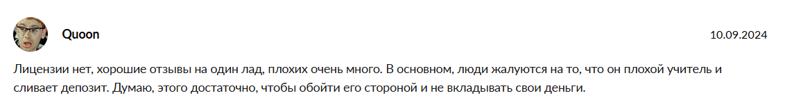 Существуют также и жалобы на то, что автор плохой учитель и сливает депозит своих клиентов из-за чего просят обходит его стороной.