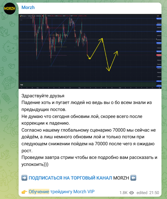 Предлагаемое трейдером Morzh обучение на телеграм-канале доступно лишь подписчикам его Vip-группы. Почти под каждым своим постом, где автор любит демонстрировать свою финансовую аналитику по инвестициям, Игорь оставляет ссылку на свой платный телеграмм-канал.