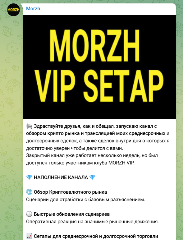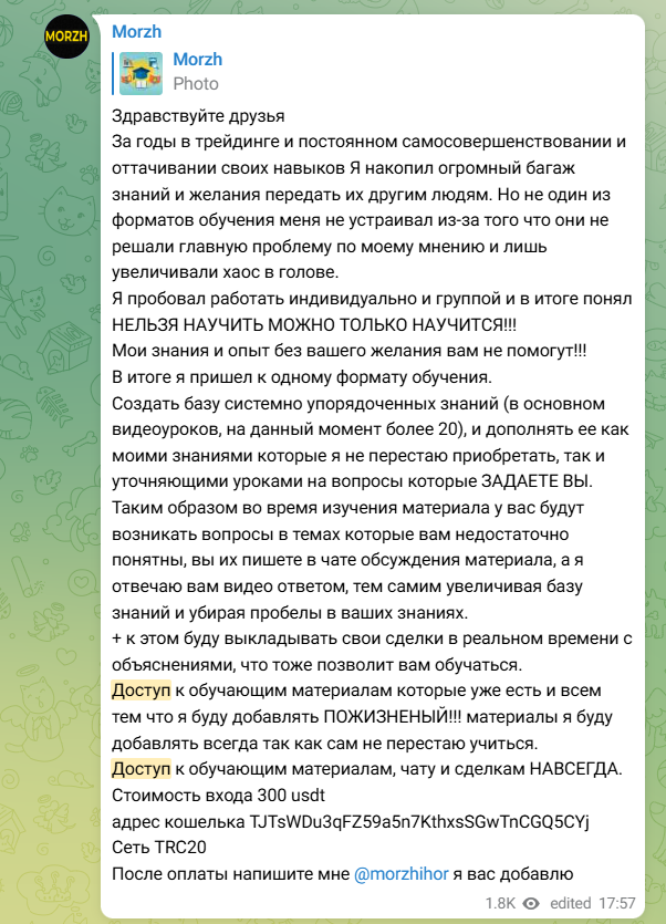 Morzh о трейдинге и курсе крипты пишет основные полезные по собственным заявлениям статьи на своем платном канале. Игорь сообщает, что готов поделиться своим огромным багажом знаний и передать их клиентам, но поскольку ни один из вариантов обучения его не устраивал, он решил создать закрытую группу, куда приглашает своих подписчиков. Стоимость пожизненного доступа к материалам Игоря составляет 300 Usdt. На апрель 2025 года это примерно 25 000 рублей или ровно 300 долларов.