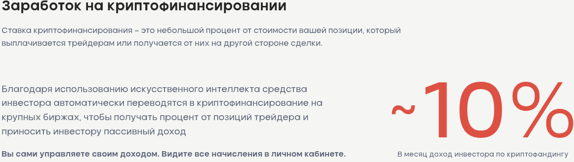 Активные пользователи могут стать прямыми партнерами компании Mount Liberty LLC и биржи по инвестициям «Маунт Либерти» и получать дополнительный процент от дохода всей компании. Помимо этого, вкладчики сервиса могут зарабатывать на крипто финансировании. Средний доход инвестора составляет 10% в месяц на алготрейдинге, т.е. за деньги пользователя торгует искусственный интеллект.