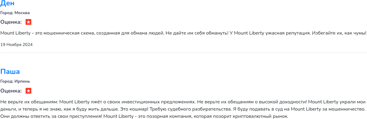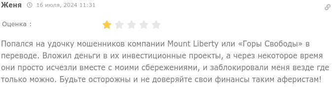 • О компании Mount Liberty LLC и бирже по инвестициям «Маунт Либерти» есть только отрицательные отзывы, где клиенты пишут про пирамиду и развод.