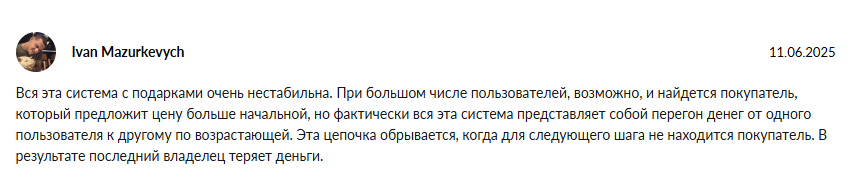 Другие пользователи отмечают невозможность стабильного заработка на подарках и считают, что это неизбежно приведет к потере денег.
