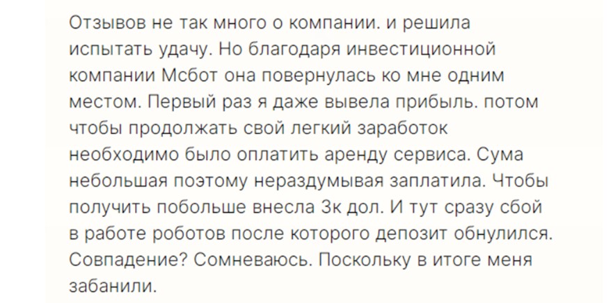 На сторонних сайтах мало отзывов об MSBOT Tech: робот не особо популярен, большого количества покупателей не было. Есть сообщение о том, что робот сливает деньги.
