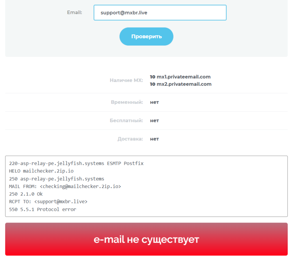 На сайте брокерской компании указана электронная почта – support mxbr live. Якобы она предназначена для приема обращений пользователей. Оказалось, что этого адреса не существует. Других контактов мы не нашли. Это еще один признак, свидетельствующий о мошенничестве.