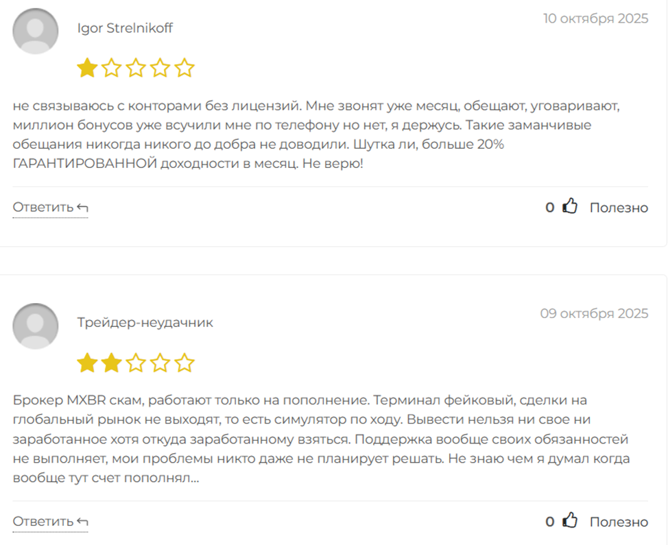 Этого вполне достаточно, чтобы убедиться в мошенничестве брокера Mxbr Live. Также в поиске надежных компаний помогают отзывы опытных и начинающих трейдеров. Поэтому приглашаем вас оставить комментарий, если у вас есть, чем поделиться с другими пользователями.