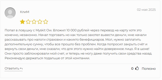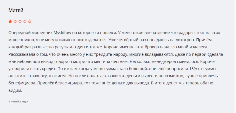 Если заглянуть в интернет и поискать отзывы о Myskitow net, картина вырисовывается просто апокалиптическая. Ни одного позитивного поста на независимых площадках вы не найдете, зато негатива – хоть отбавляй. Бывшие клиенты в один голос кричат, что этот «международный брокер» – обыкновенные кидалы. Они присваивают деньги трейдеров и под всякими нелепыми предлогами отказываются возвращать депозиты.