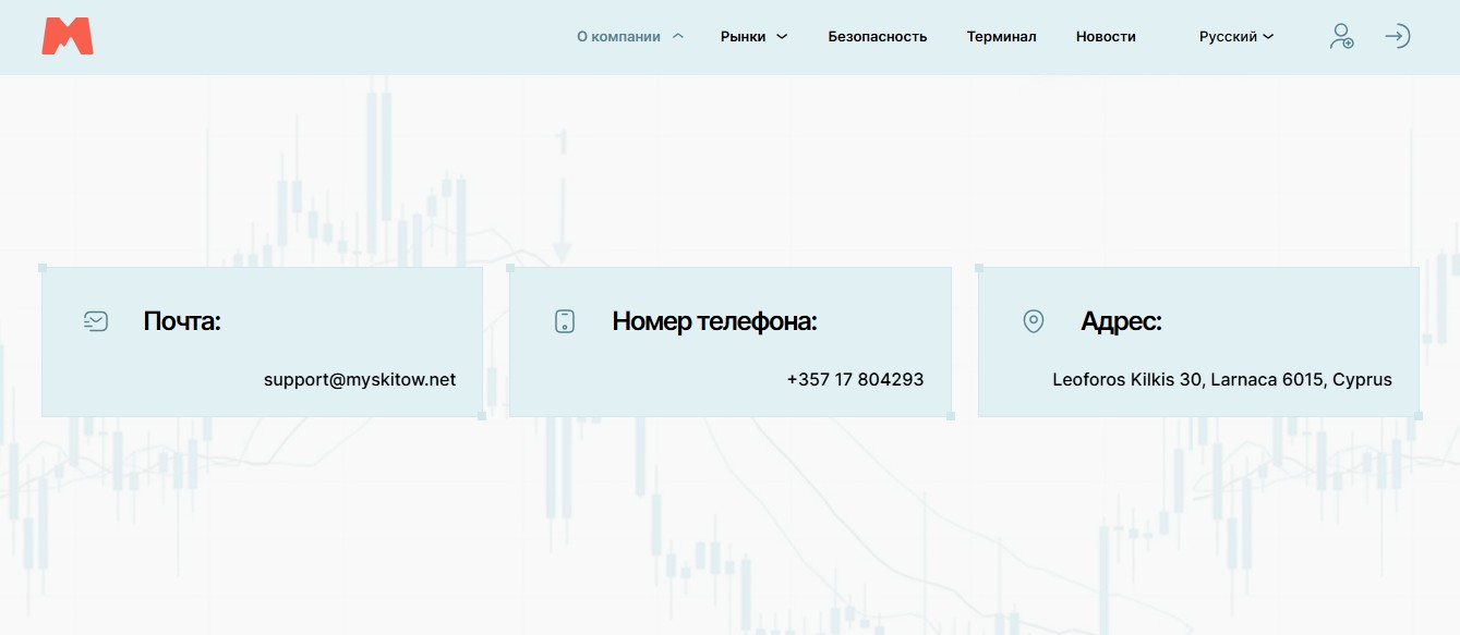 Работает это «брокерское чудо» сразу с двух сайтов: myskitow net и myskit-ow worldd, один – для торговли, другой – для рекламы. Для связи с саппортом предлагают email, телефон и форму обратной связи. Адрес офиса якобы расположен на Кипре.