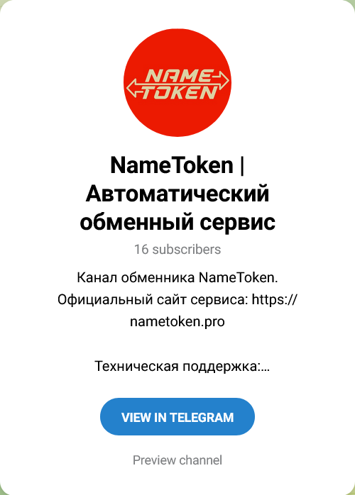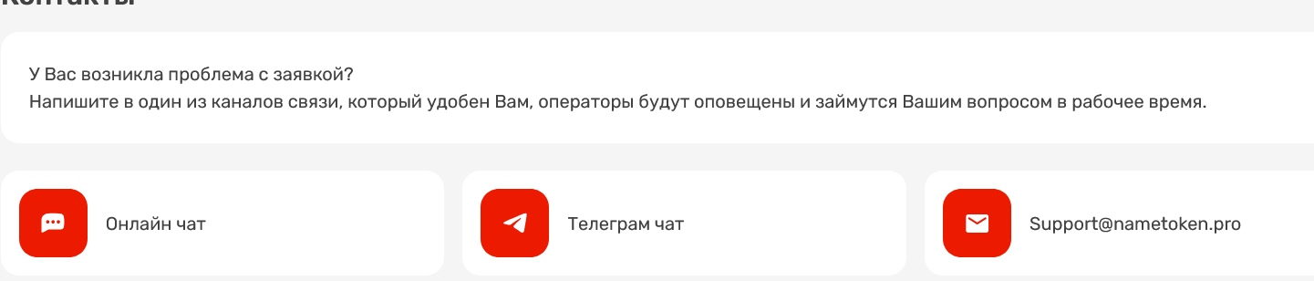 Служба поддержки представлена электронной почтой support nametoken pro, каналом в Телеграмм с ником name token и онлайн-чатом на сайте, график работы техподдержки не афишируется.