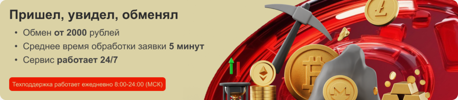 На главной странице сайта сразу бросается в глаза рекламный баннер, где написано, что обменять активы можно быстро, легко и удобно.