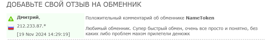 Мы не можем рекомендовать обменник Name Token к сотрудничеству. Возможно, когда создатели расширят функционал сайта, добавят больше информации, тогда и станет понятно надежный ли это партнер или обман.
