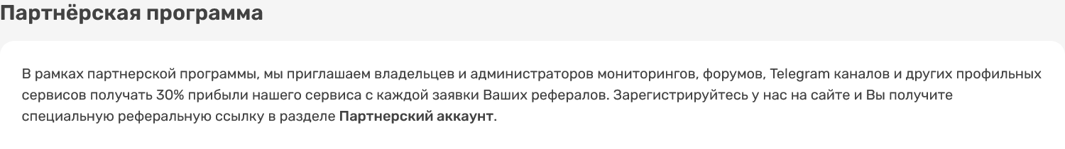 Как формируется курс для обмена, неизвестно, также нет данных о комиссиях, которые взимаются за транзакции. У проекта работает реферальная программа для привлечения новых клиентов. Вознаграждение составляет до 30% прибыли с каждой заявки нового клиента.