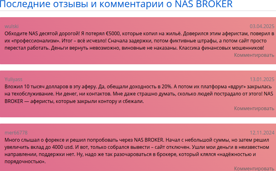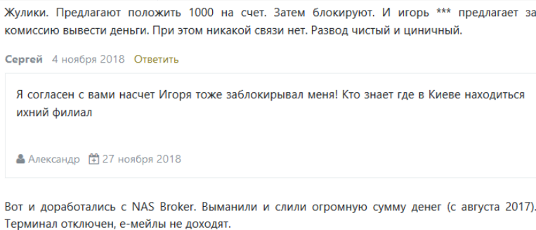 Пользователи оставляют отрицательные фидбеки, в которых пишут, что работать с биржей не стоит, так как NAS broker — скам.