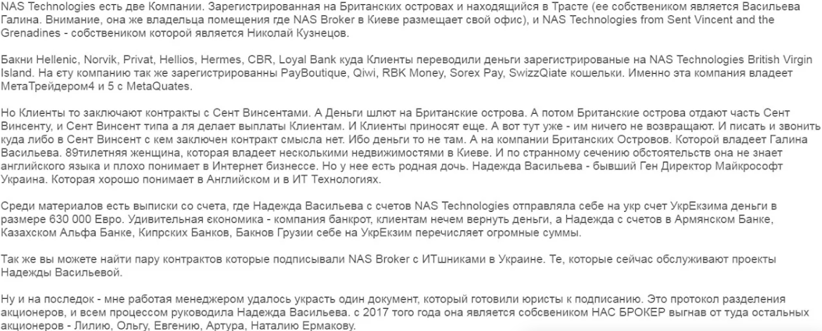 Судя по вышеперечисленному, финансовая компания не является честной, как ее позиционирует команда. Юридическая документация, которая подтверждает честность и надежность отсутствует. Однако и это еще не все. На профильных площадках мы нашли переписку с бывшим менеджером «НАС брокер».