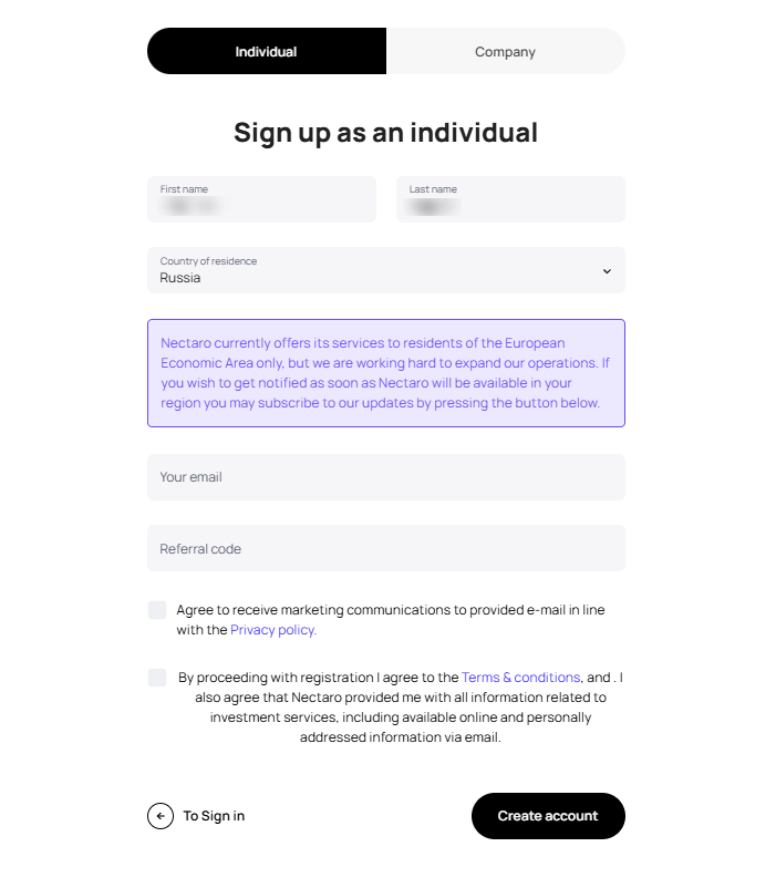 Nectaro предоставляет обслуживание только для клиентов, проживающих в европейской экономической зоне – создать аккаунт может человек старше 18 лет, с действующим паспортом или ID, подтверждающим его статус. Соответственно, зарегистрироваться на сайте, будучи резидентом других стран, не получится – система сразу об этом предупреждает.
