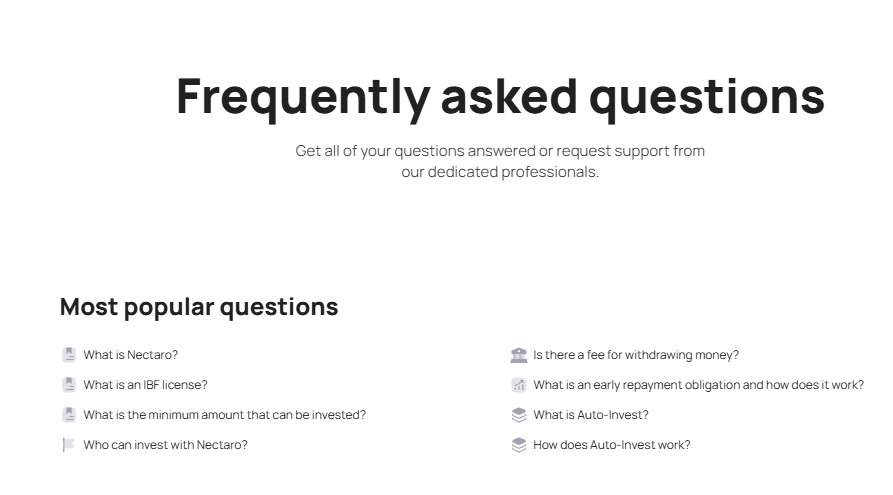 На сайте проекта есть большой раздел FAQ, где клиент может найти ответы на многие интересующие его вопросы. Если возникнут трудности, связанные с убытком или блокировкой депозита, то пользователь может обратиться на почту support@nectaro eu.