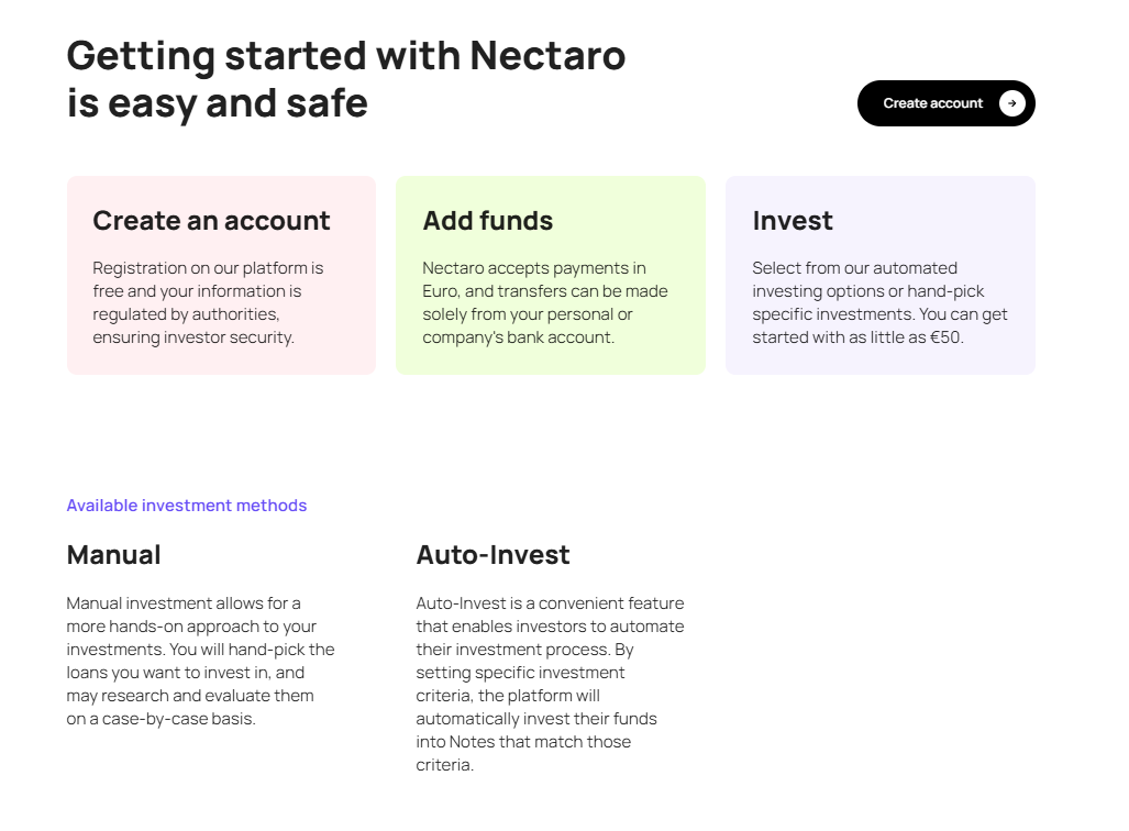 Клиент Nectaro может инвестировать вручную, в специальном разделе доступны актуальные предложения с описанием условий сделки. Человек выбирает, какую сумму он готов «одолжить» и сразу видит, когда стоит ожидать возврата средств.