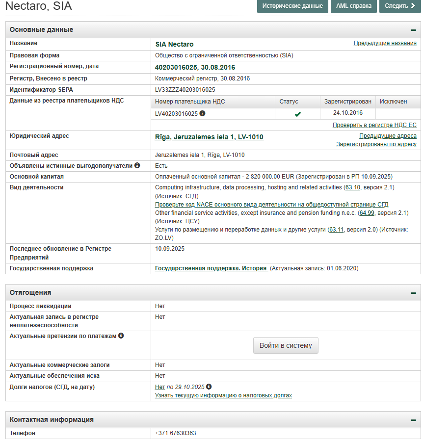 Компания SIA Nectaro зарегистрирована в Латвии, предоставлены реквизиты – мы использовали информацию для проверки, такая фирма действительно есть в местном налоговом реестре. В сфере деятельности указано, что организация является инвестиционной брокерской фирмой и может работать с финансовыми инструментами и займами. При регистрации уставной капитал был более €2,820,000, что является значительной суммой, которая может использоваться для компенсации убытков клиентов в случае возникновения проблем.