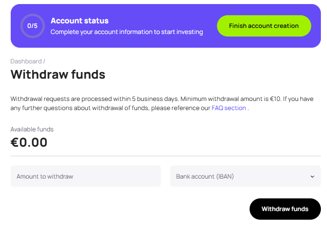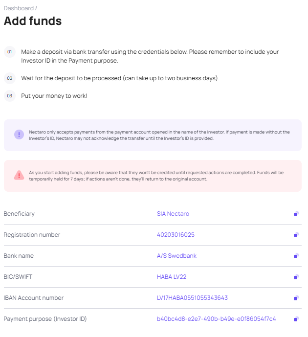 Выводить прибыль можно в личном кабинете, есть минимальный лимит – от €10. Отправить средства можно только на банковский счет, который зарегистрирован на имя владельца аккаунта, чтобы предотвратить отмывание денег. На обработку заявки администрация Nectaro выделяет до 5 рабочих дней, также допускается, что для обслуживания платежа банком потребуется еще до 2 дней. Клиенту могут отказать, если ранее он предоставил неполную информацию о себе, были обнаружены нестыковки или указанный счет не соответствует политике безопасности.