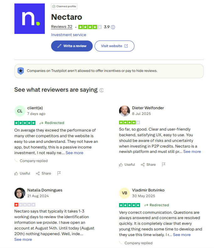 В отзывах о Nectaro большинство пользователей отмечают удобство интерфейса и простоту регистрации – из-за этого клиенты возвращаются к платформе и продолжают в нее инвестировать. Так как компания относительно недавно работает на рынке, она получает положительный отклик на первых этапах своего развития. У проекта хорошие оценки, но встречаются и недовольные пользователи, которые жалуются на продукт и работу сервиса.