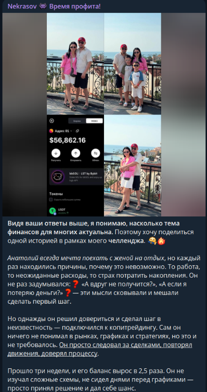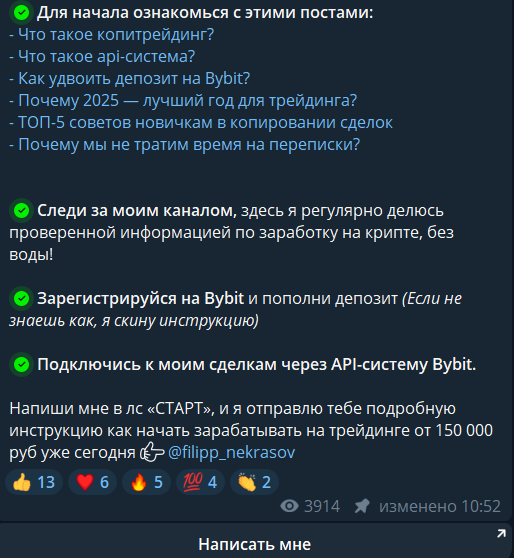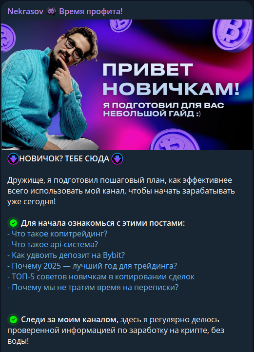 В сети удалось найти один из постов, где трейдер предлагает подписчикам пройти краткое обучение по ранее опубликованному контенту в телеграмм-канале Фила Nekrasov «Время Профита», и зарегистрироваться на Bybit для начала торговли.