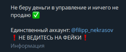Мы не рекомендуем пользоваться платными услугами трейдера и переходить на внешние ссылки, которые он добавляет в своих постах. Есть признаки того, что Фил Некрасов – мошенник.