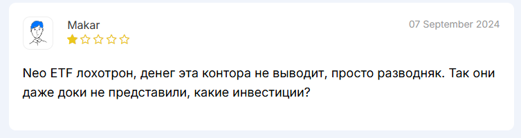 Мнения клиентов крайне негативные. Neo ETF не выводит деньги. Пользователи сообщают о блокировка аккаунт без объяснений. Многие потеряли все вложенные средства полностью.