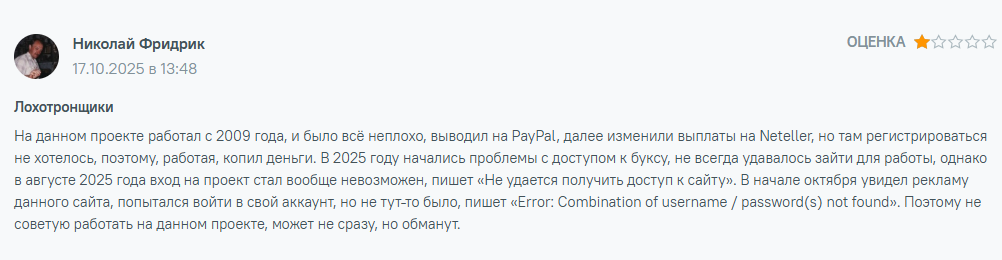 Независимые же ресурсы демонстрируют негативный опыт сотрудничества. Отзывы о NeoBux в них отрицательный. Кому-то действительно удавалось зарабатывать, может и незначительные, но деньги – но это было несколько лет назад. В декабре 2025 года сервис не подтверждает авторизацию в системе.