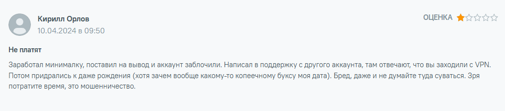 - негативные отзывы подтверждают опасения по поводу обмана, соответственно, заработать здесь с высокой долей вероятности не получится.